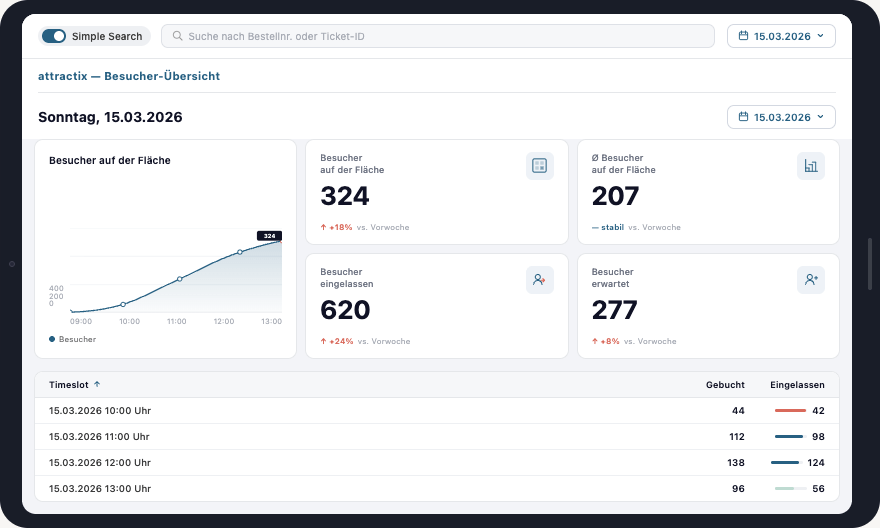 Besucher auf der Fläche, Timeslots und Einlass – alles live in einem System, damit du jederzeit den Überblick behältst.